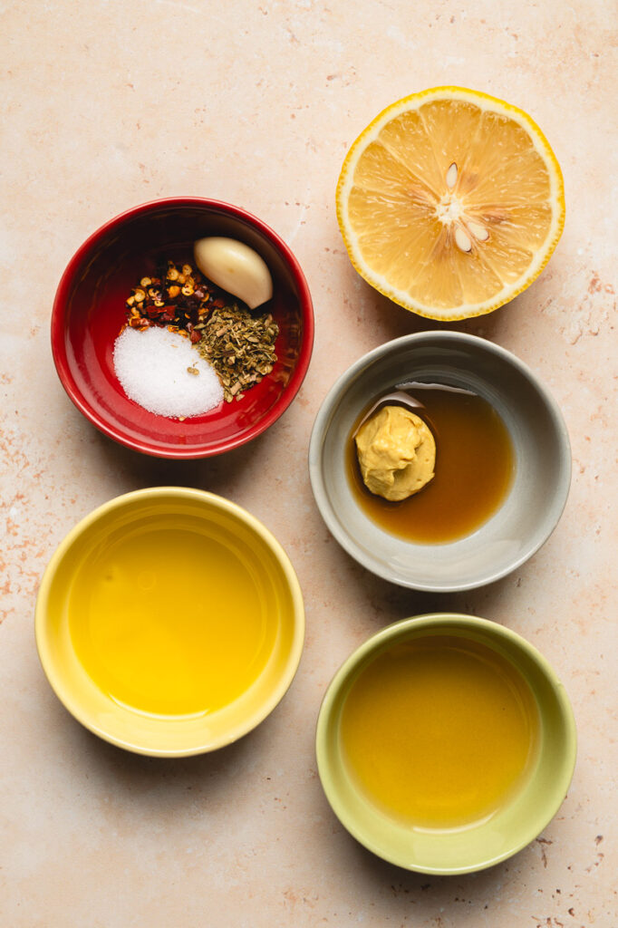 - Dressing ⟶ A tangy vinaigrette made with vinegar, lemon juice, and olive oil packs in flavor while keeping the salad light and refreshing.