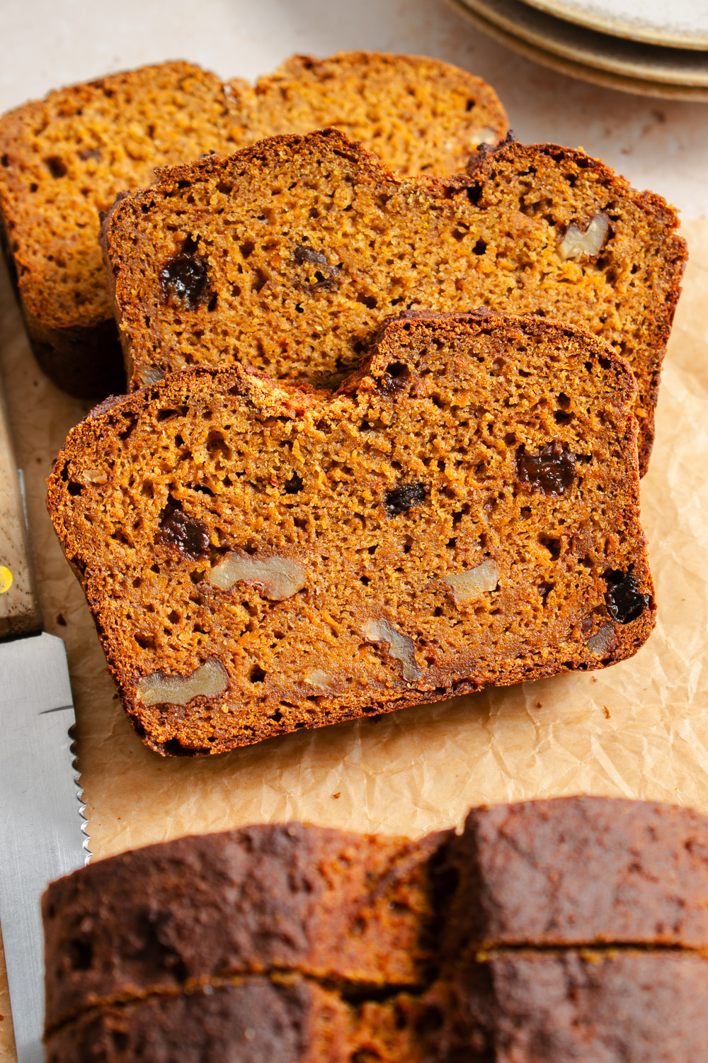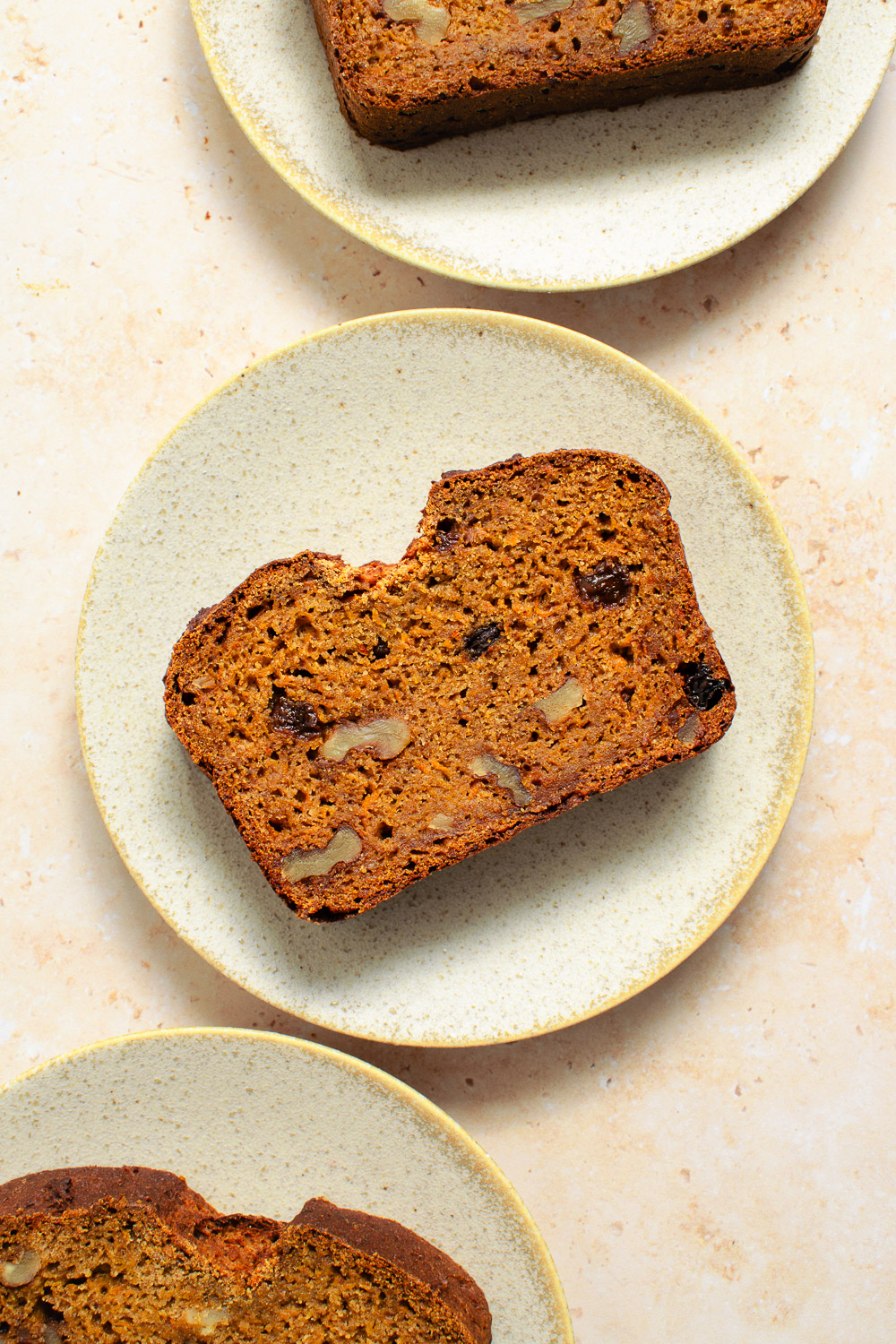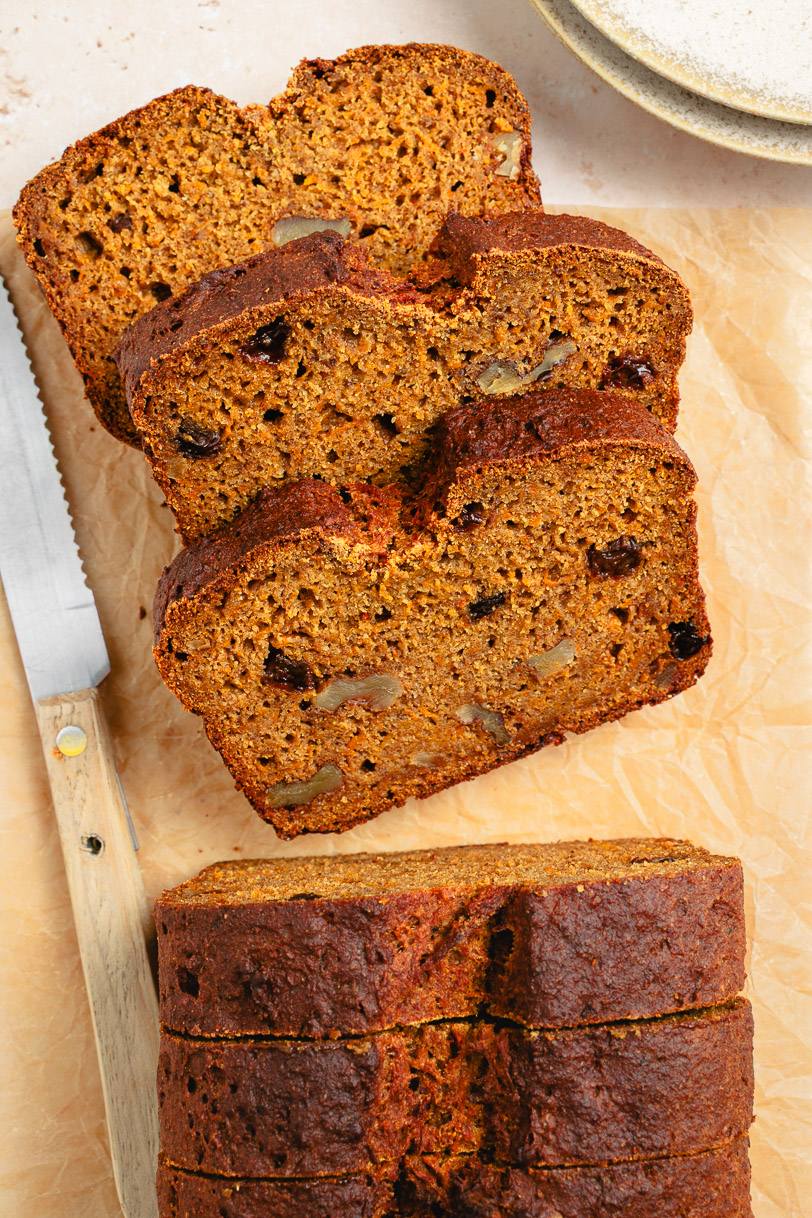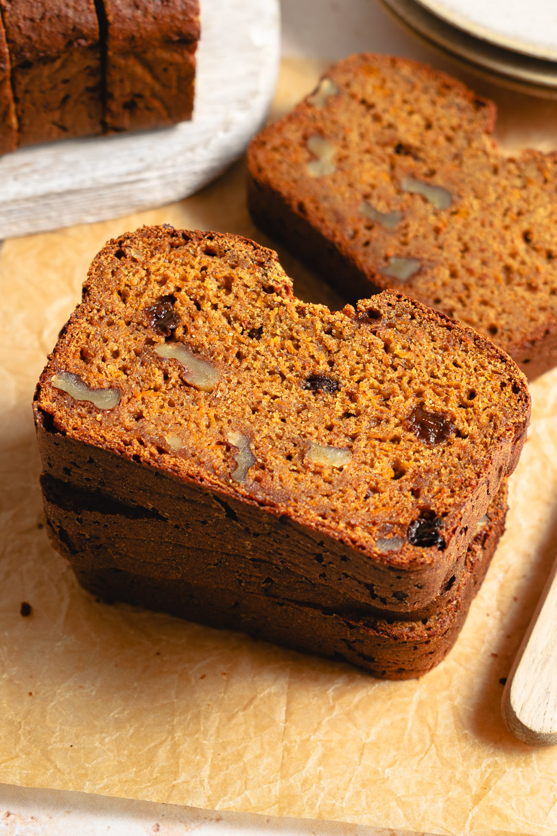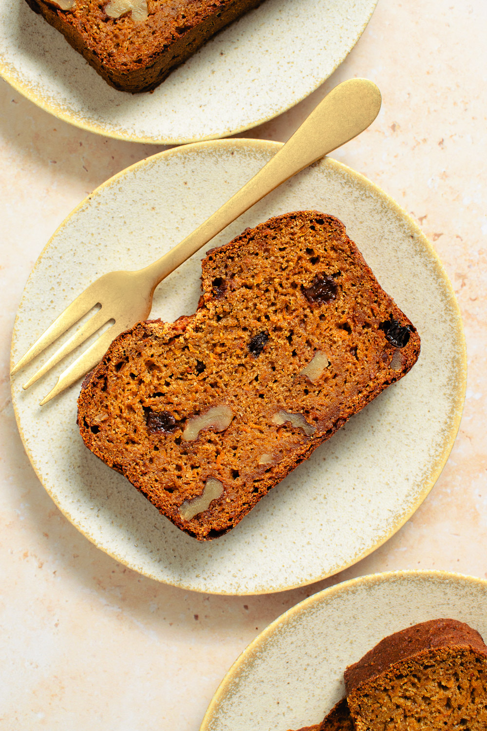 This vegan carrot bread is delicious on its own, but for a heartier meal or snack, serve it with some high protein yogurt or nut butter.