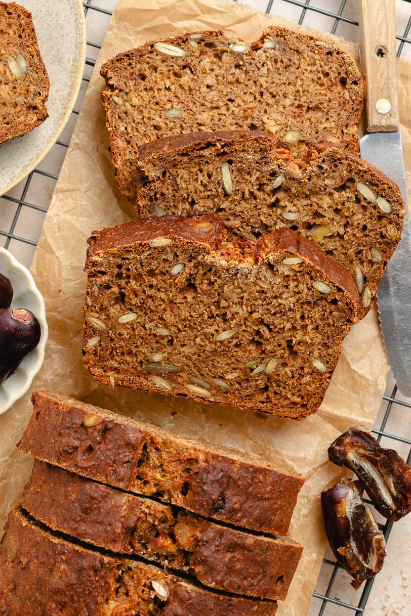 - Dates ⟶ This banana bread is completely fruit-sweetened, using the natural sweetness of bananas and dates. Choose dates that are very soft and sweet, such as Medjool dates.