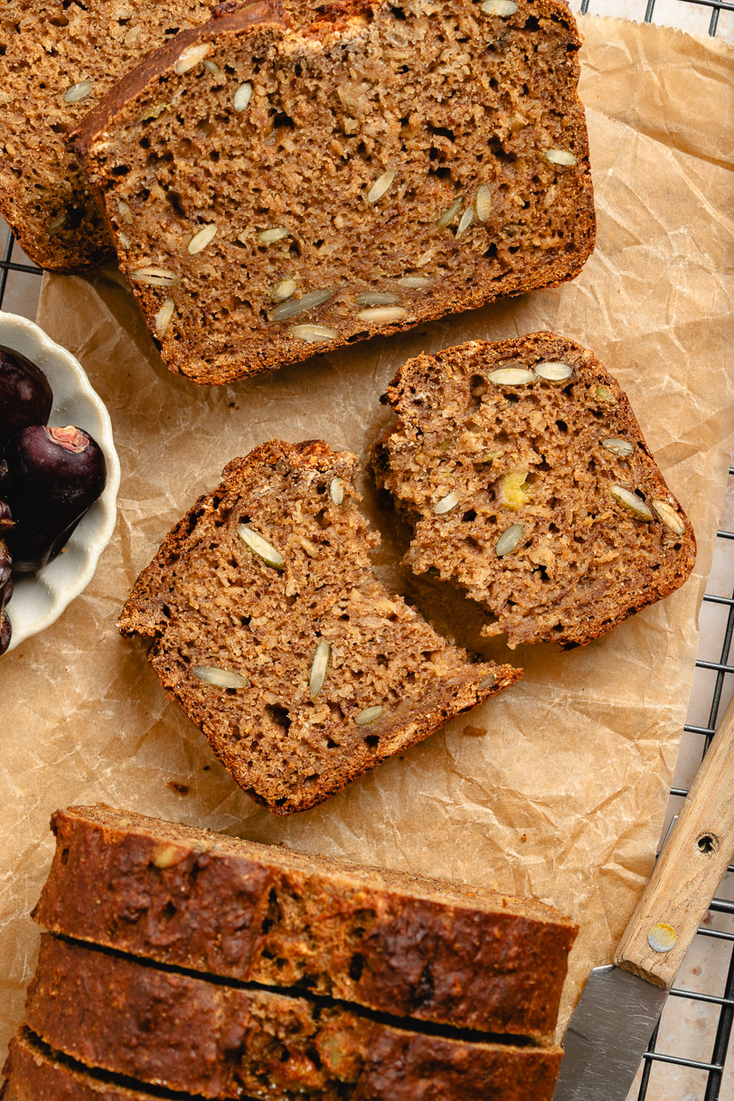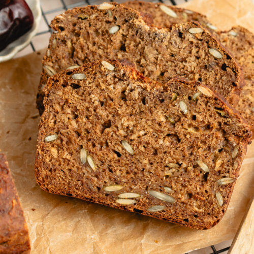 This vegan banana bread is delicious on its own, but for an even heartier meal or snack, serve it with some high protein yogurt or nut butter.