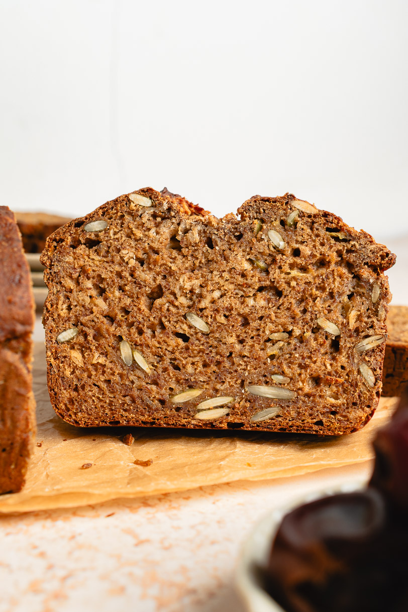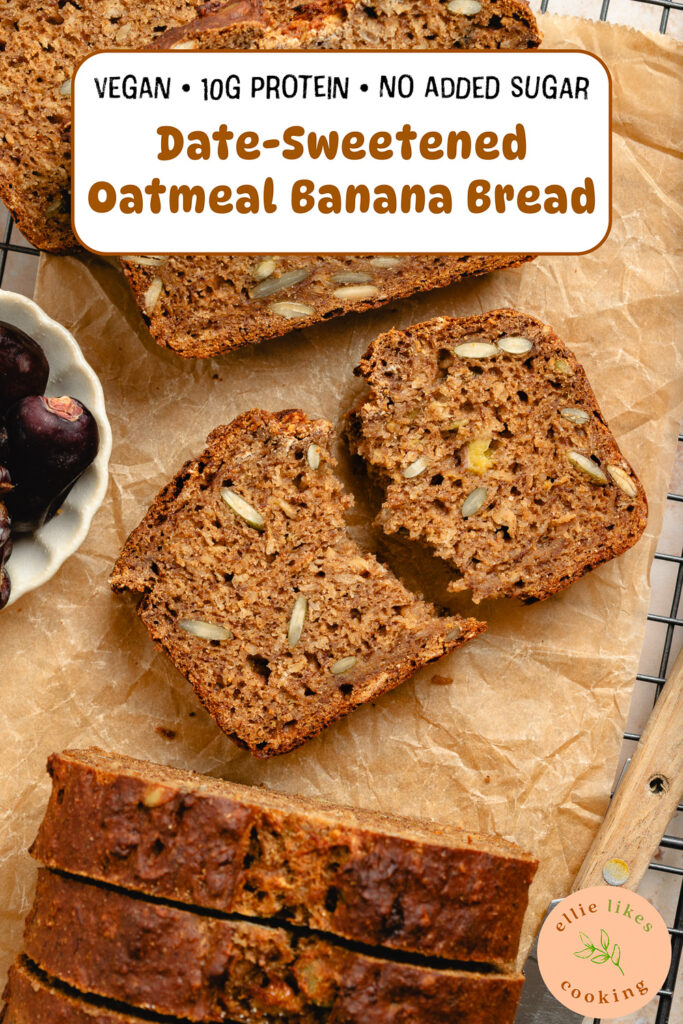 Healthy and delicious vegan banana bread made with whole wheat flour, rolled oats, no oil, and naturally sweetened with dates.