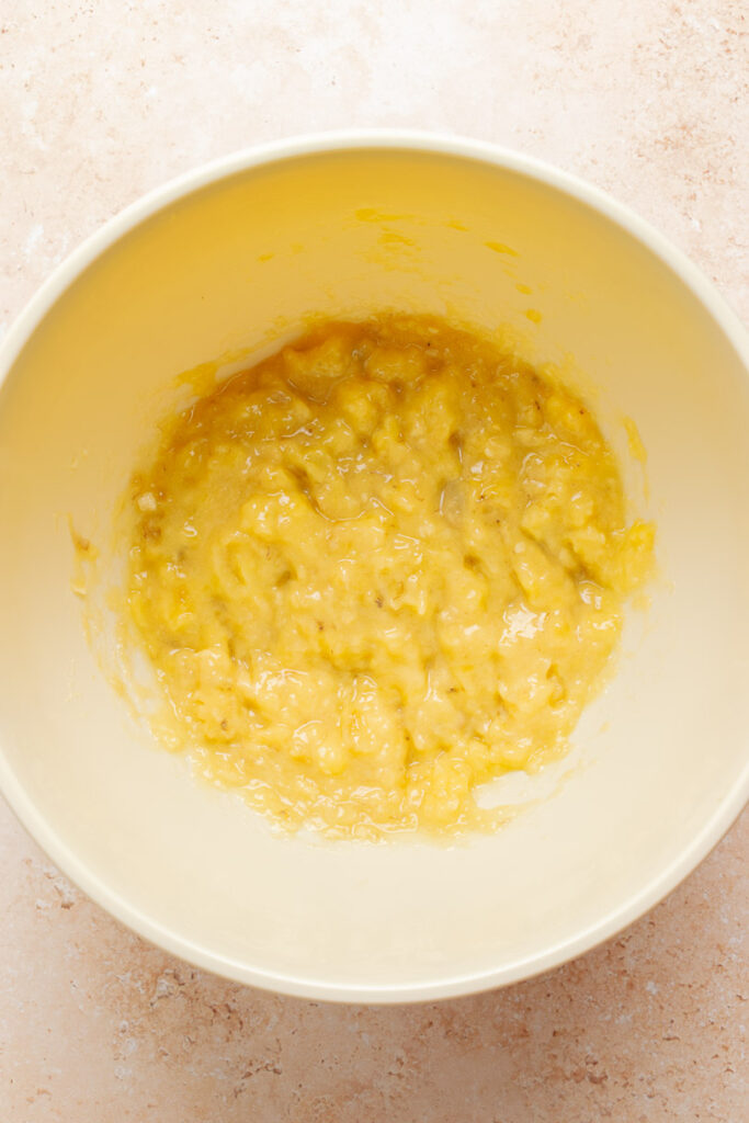 Mash bananas with a fork or potato masher. Some small chunks are okay.