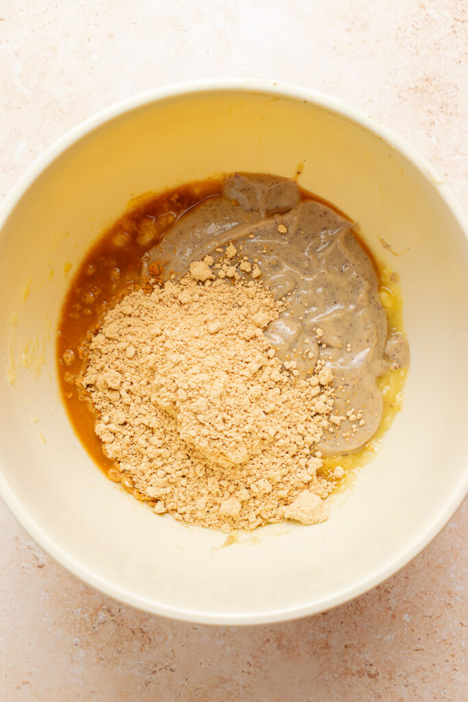- Silken Tofu ⟶ A little bit adds moisture and some protein to improve the texture.