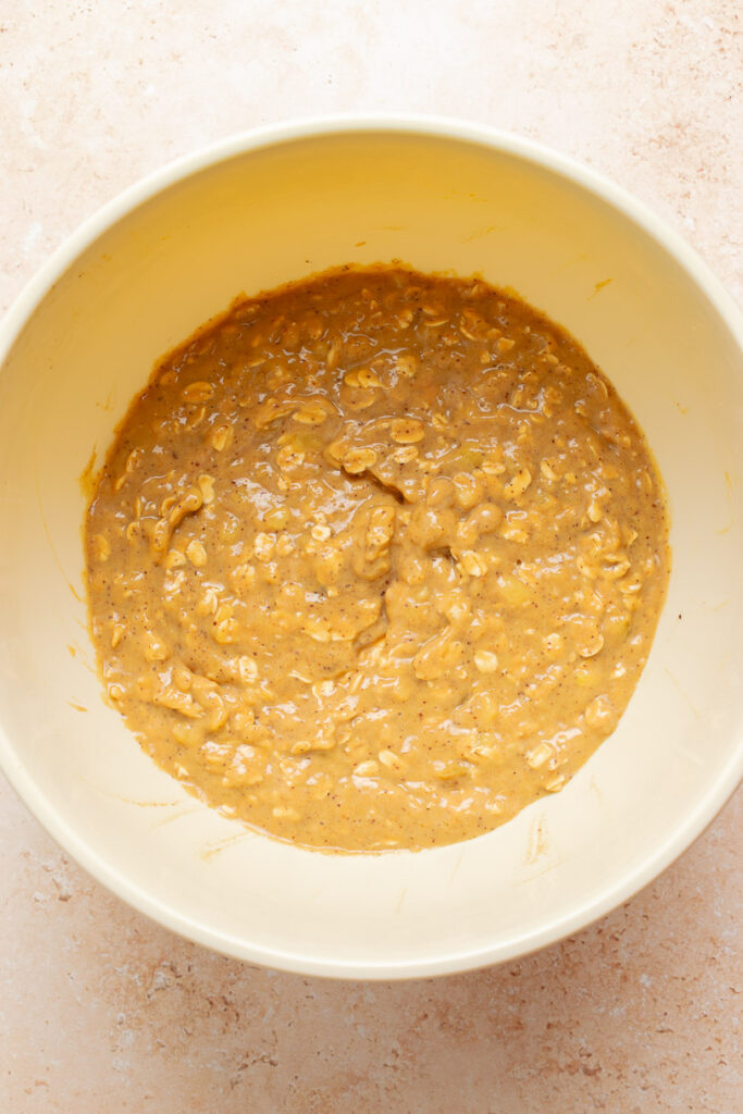 Soak the oats ⟶ Mix the oats with the wet ingredients and let them soak for 20 minutes before adding in the remaining dry ingredients. This helps make the banana bread soft and moist.