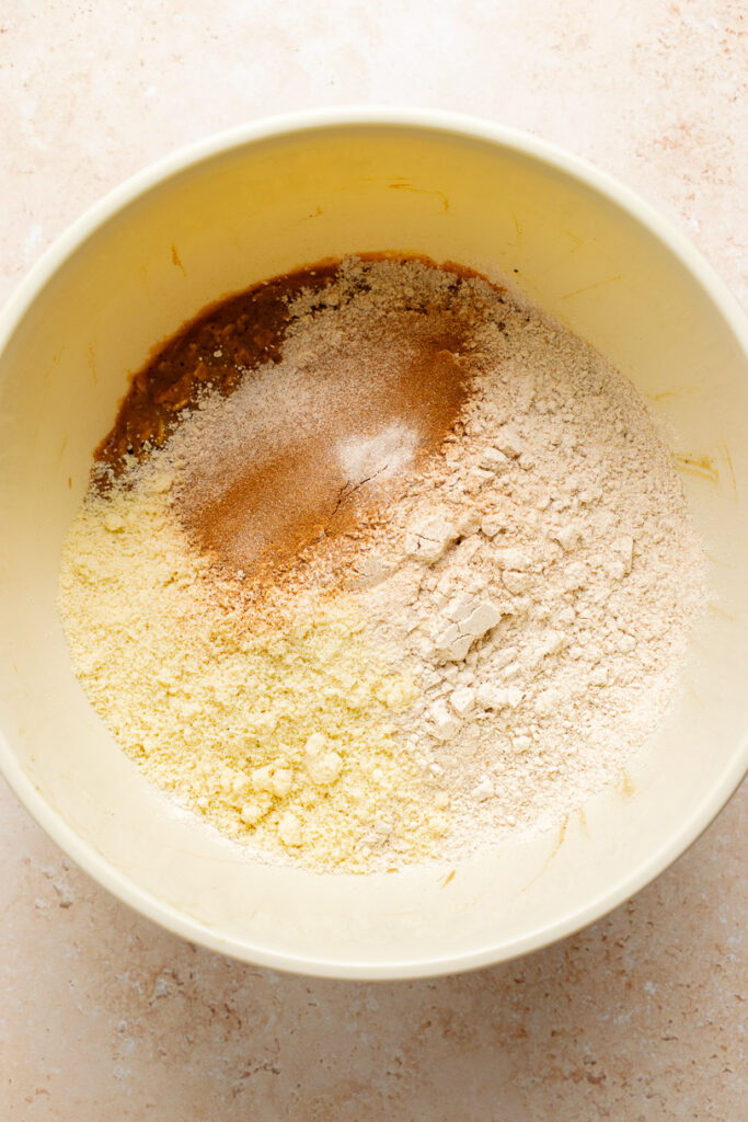 - Mix dry ingredients: Whisk together whole wheat flour, almond flour, baking powder, baking soda, and cinnamon.120 grams (1 cup) whole wheat flour, 28 grams (¼ cup) almond flour, 1½ tsp baking powder, ½ tsp baking soda, 1 tsp cinnamon