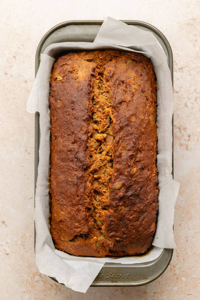 Leave some parchment paper overhang ⟶ When lining the loaf pan, use a little extra parchment paper so that there’s some excess paper hanging over the sides. This makes it easier to lift the bread out of the pan after baking.