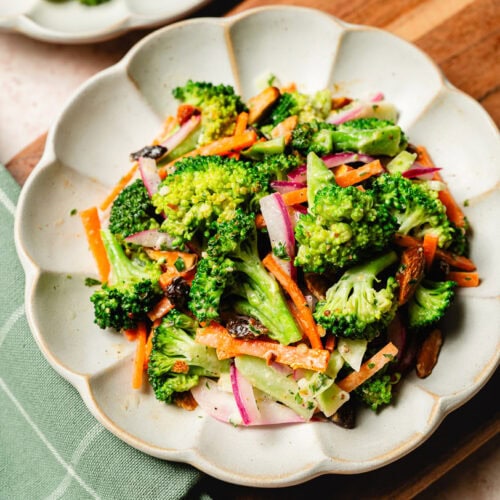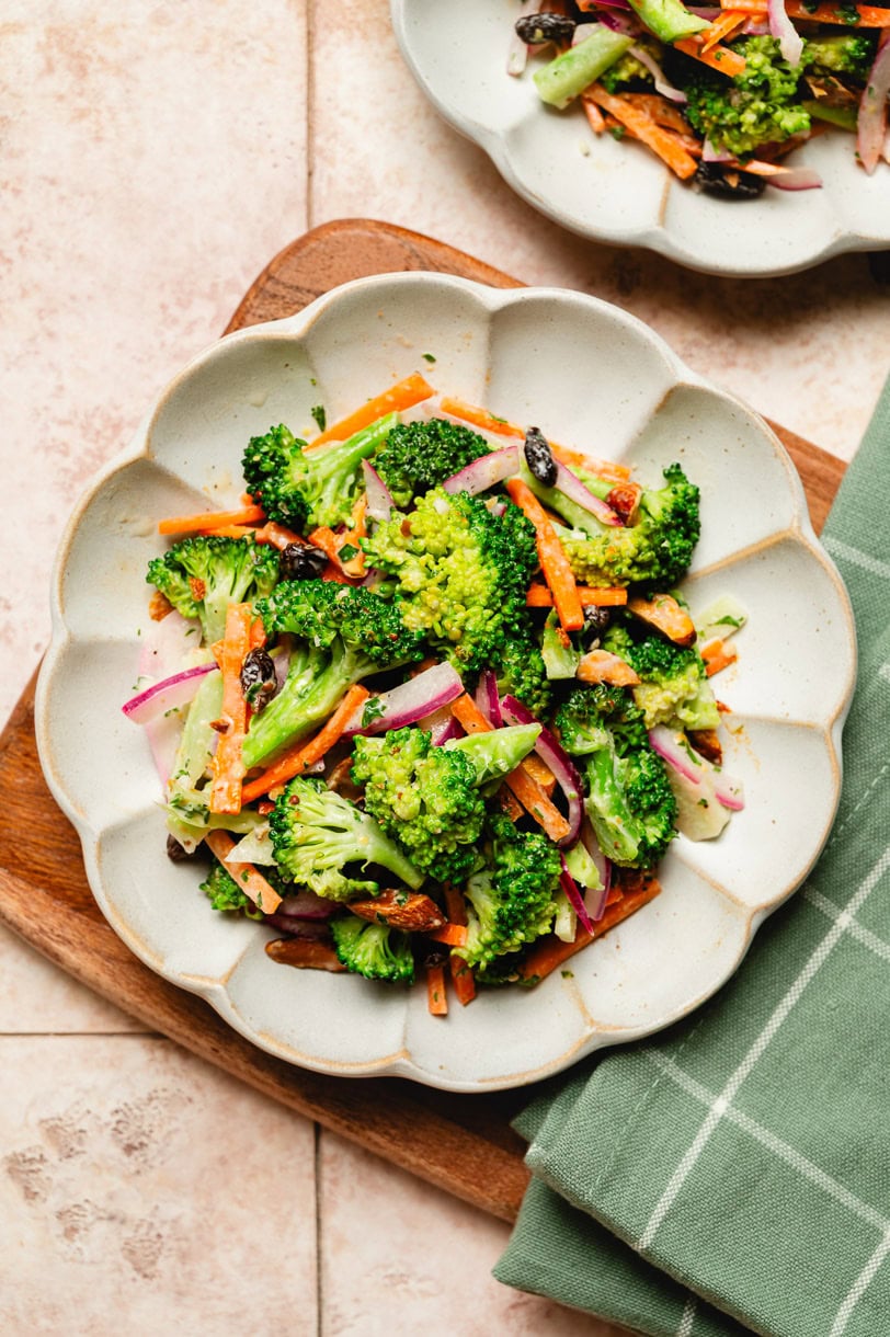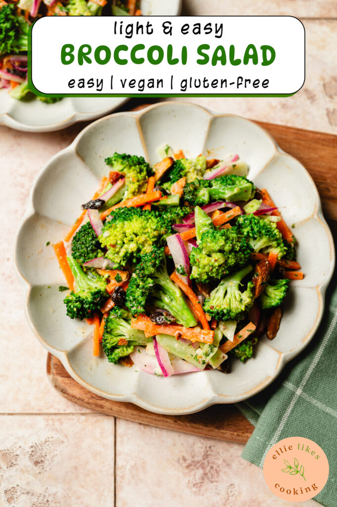This lightened up broccoli salad is easy, refreshing, and tasty! Made with fresh broccoli, raisins, nuts, and a creamy dairy-free dressing.