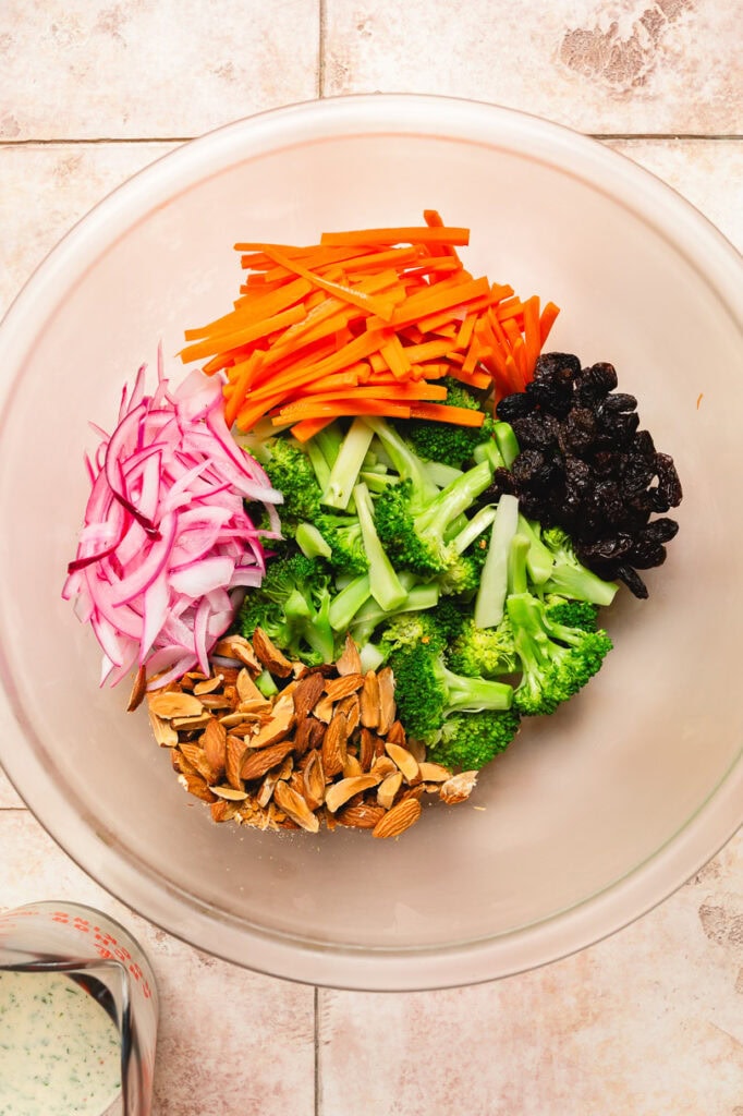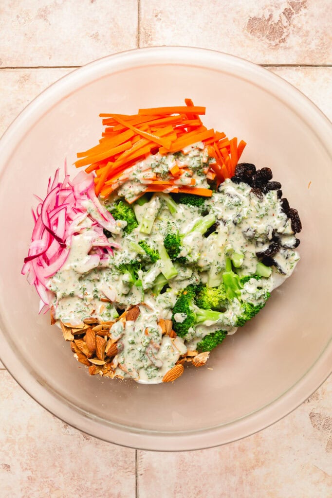 - Mix: Dry the broccoli with a towel then add to a large bowl along with the carrots, nuts/seeds, raisins, and vegan bacon (if using). Pour the dressing with the onions over and toss well to combine. Taste and add more salt, pepper, or lemon juice as desired.