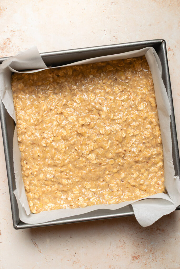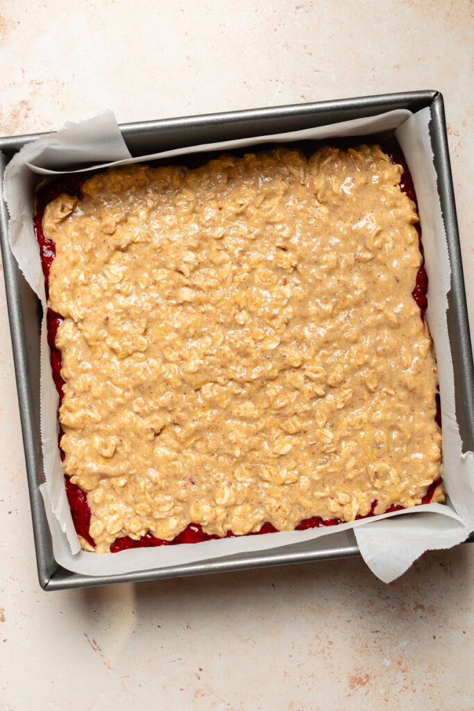 - Add about 2/3 of the oat mixture to your lined baking dish. Spread the jam filling over. Dollop the remaining oat mixture on top (it's okay if it doesn't completely cover). You can also add a few extra dollops of peanut butter if you'd like.