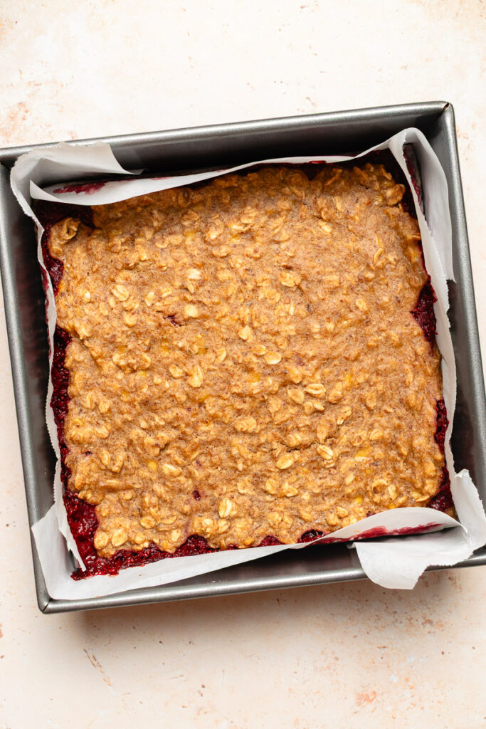 Mix oat bar ingredients together until well combined, then add about 2/3 to a lined 8×8-inch pan. Spread jelly/jam on top. You can make the chia jam in the recipe card, or use a pre-made jelly/jam. Top with remaining oat mixture. You can spread it out into a thin layer to cover, or dollop it on top and leave some gaps. Bake at 350°F/180°C for about 30 minutes until the center is firm. Cool completely.