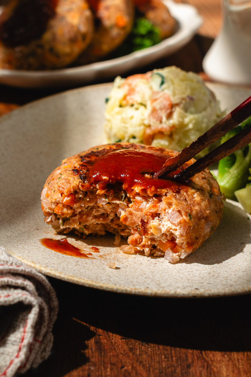 In Japan, hambagu is usually served with plain steamed rice. It’s also delicious with roasted potato wedges. Don’t forget to serve it with some veggies like a salad, roasted veggies, or steamed broccoli and carrots.