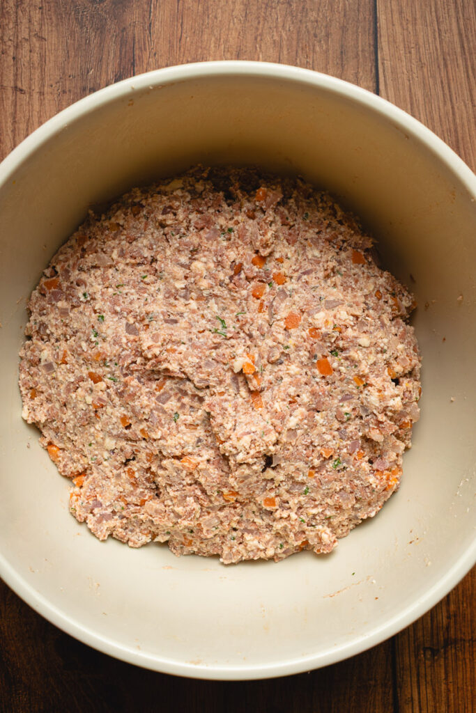 Combine vegan ground beef, tofu, flax, cooked onions and carrots, breadcrumbs, garlic, parsley, thyme, oregano, black pepper, and 2 tbsp of sauce.